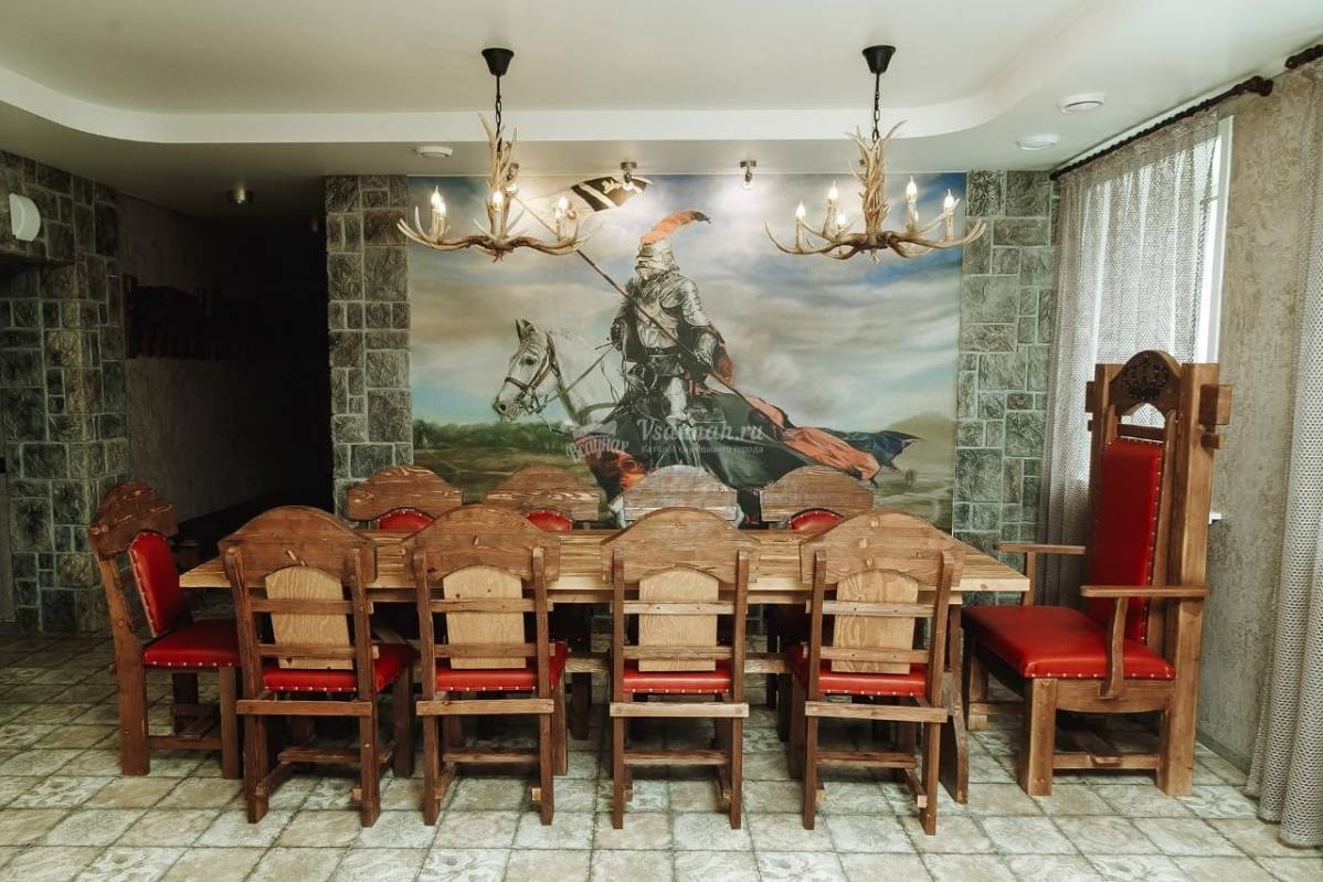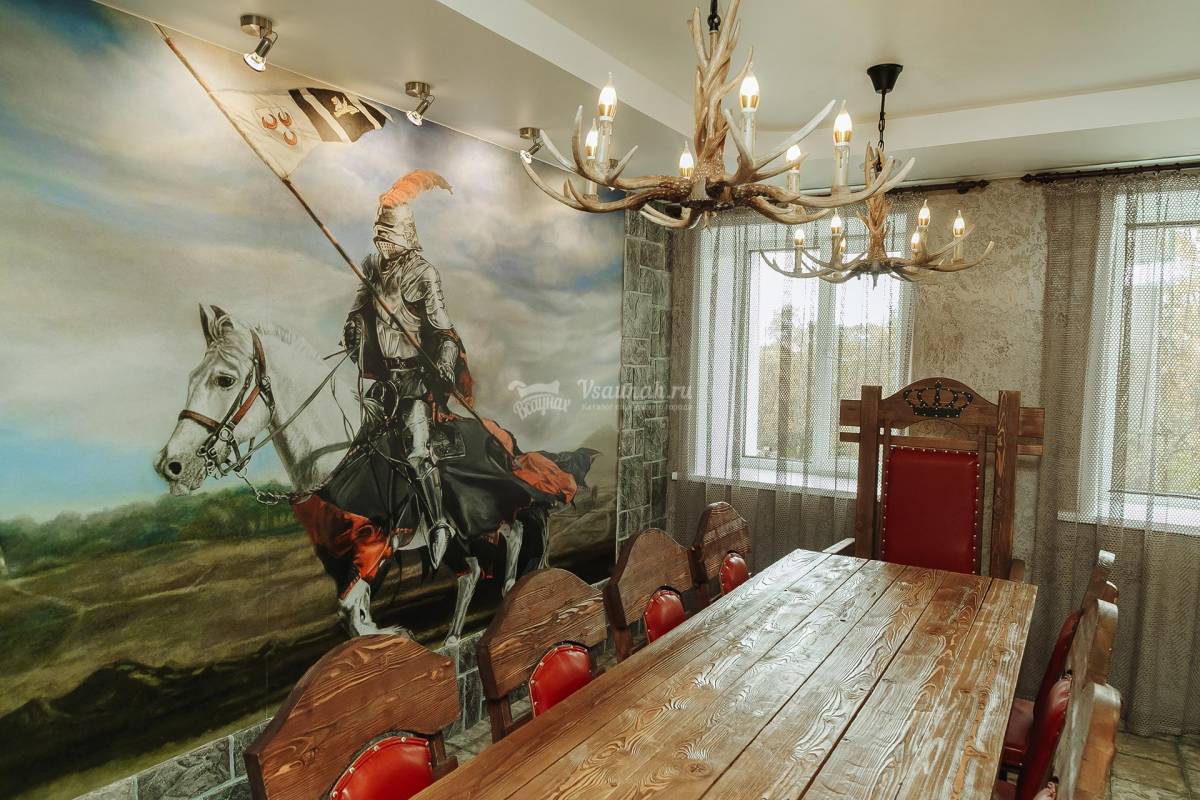 Атмосфера средневековья царит в зале сауны "Замок". Вместительный зал с дубовым столом и массивными стульями рисует в воображении образы времен короля Артура. Финская парная, купель, хамам и бильярдный стол располагают к отдыху по-королевски.