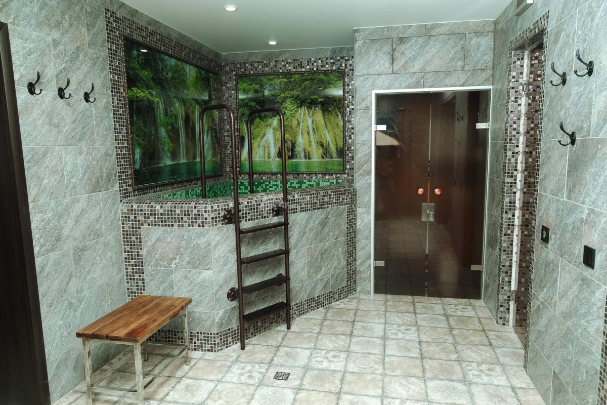 Стиль "ЭКО-сауны" дает ощущение единения с природой. К этому располагают финская парная, хамам и бассейн с водопадом. Зона отдыха в этой сауне словно островок природы, где использованы натуральные материалы и четкие формы интерьера.